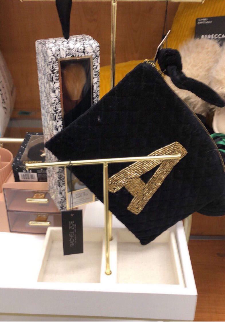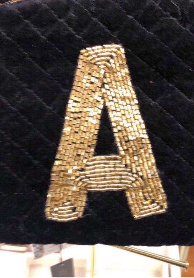 A stylish black quilted clutch featuring a gold beaded ‘A’ design.