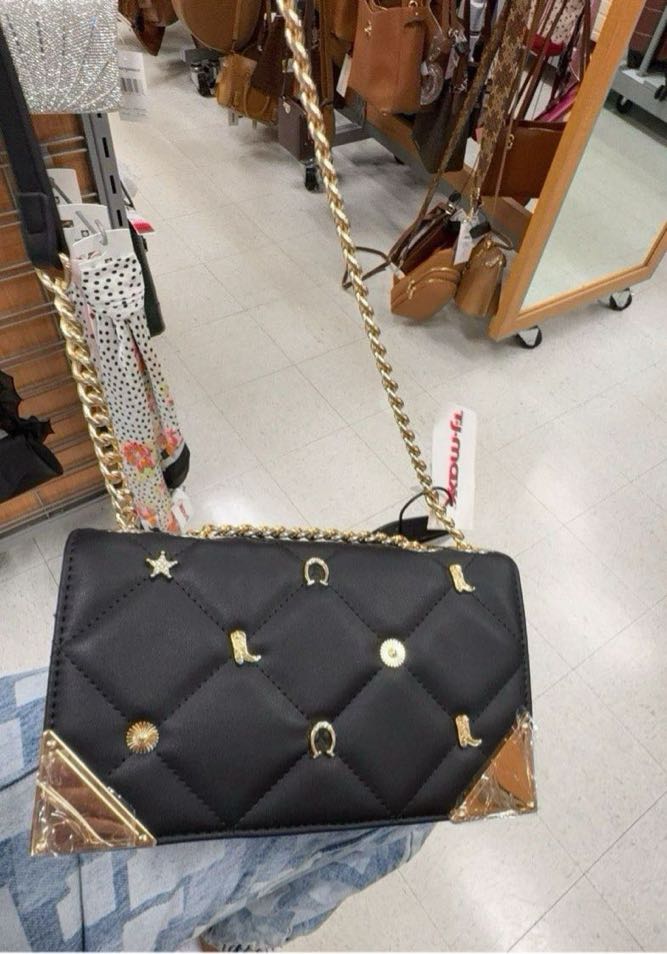 A stylish black handbag with a quilted design and gold accents, featuring decorative elements on the front.