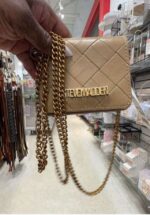 A stylish quilted crossbody bag with a gold chain strap and a prominent brand logo.
