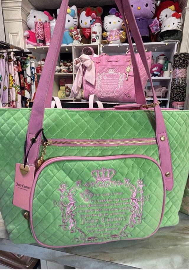 A stylish quilted tote bag in vibrant green with pink accents and decorative embroidery.