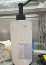 A stylish ceramic soap dispenser with a textured design, perfect for adding a modern touch to your bathroom or kitchen.