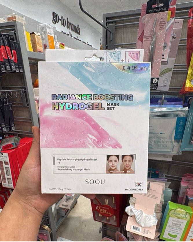 A set of hydrogel masks designed to boost radiance and hydrate the skin, featuring ingredients like peptides and hyaluronic acid.