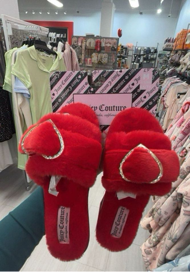 Cozy red fur slippers with a decorative heart-shaped embellishment.