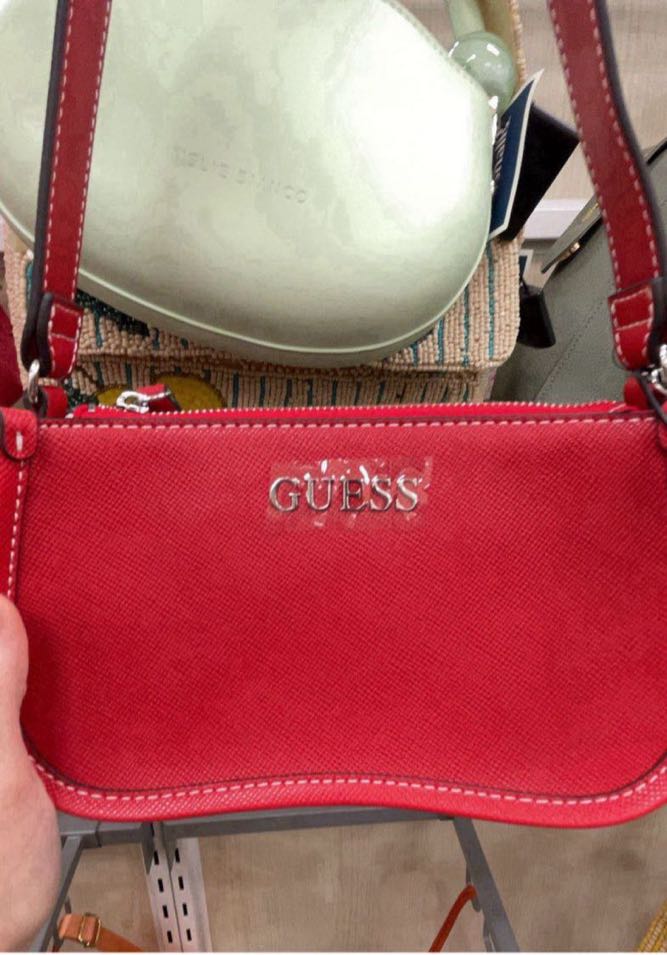 A stylish red handbag with a sleek design and the brand name ‘GUESS’ prominently displayed.