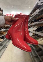 Stylish red patent ankle boots with a sleek design and a low heel.