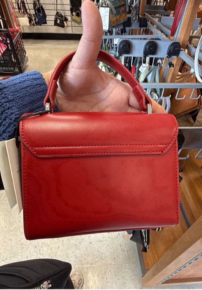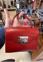 A stylish red handbag with a structured design and a top handle. It features a sleek closure and a smooth finish.