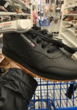 Black Reebok sneakers with a gum sole, featuring a classic design.
