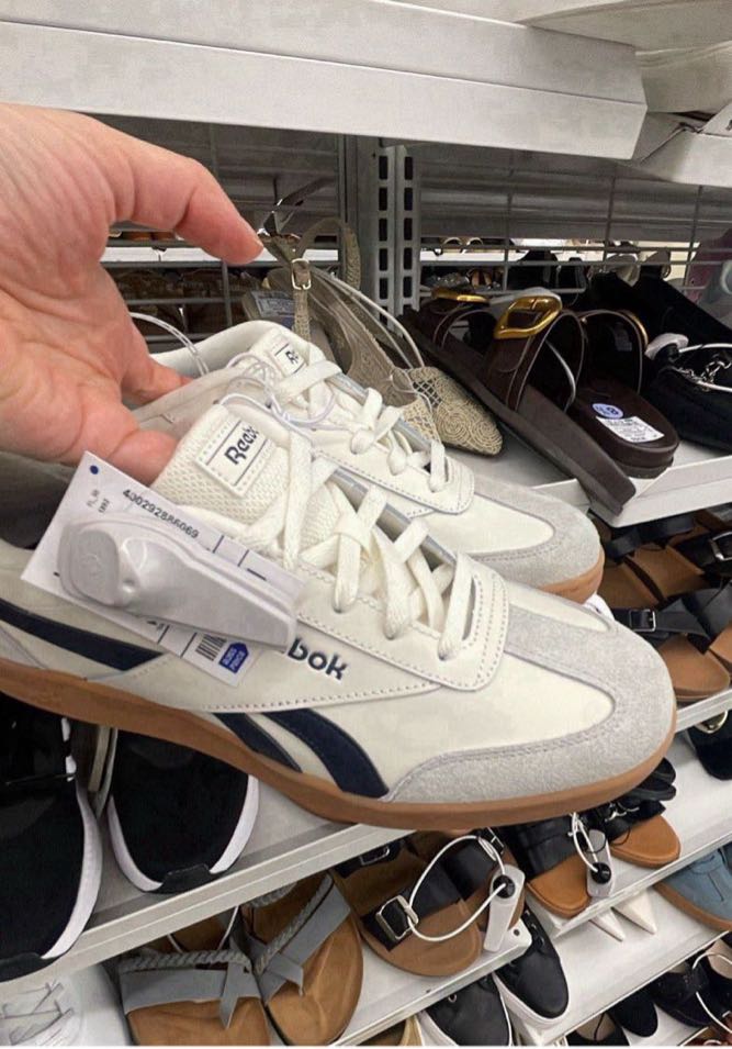 A pair of stylish Reebok sneakers featuring a white and navy design with a gum sole. Perfect for casual wear or workouts.