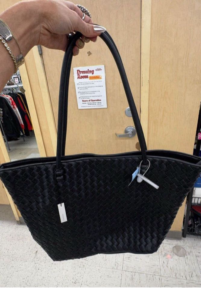 A stylish black tote bag featuring a woven design and sturdy handles.Tags on