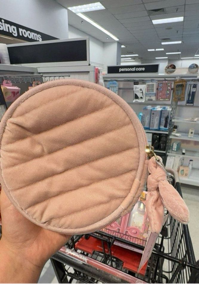 A soft, round cosmetic pouch with a quilted design and a decorative bow on the zipper.