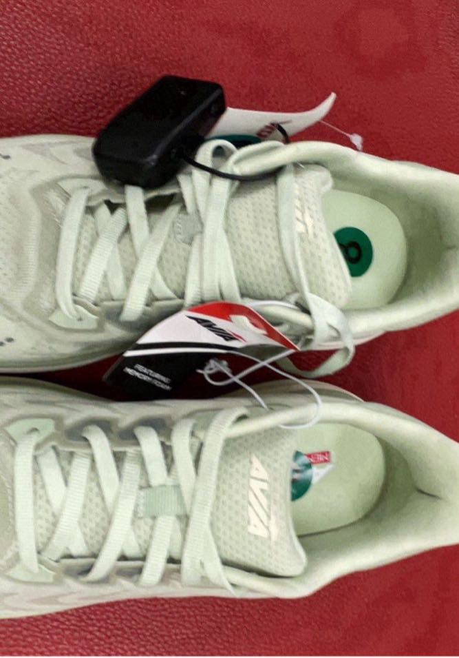 Lightweight running shoes with a mint green color and attached tags.