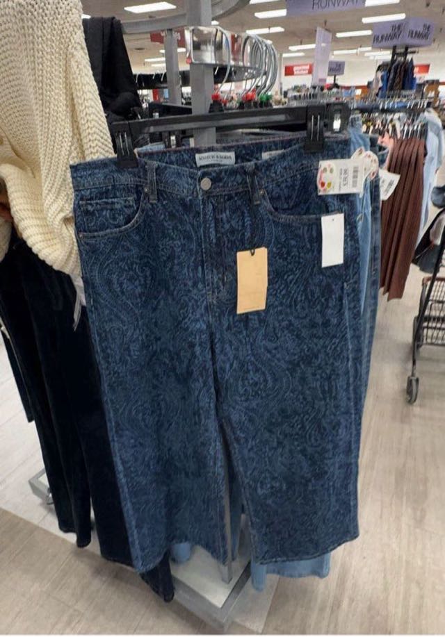 A pair of denim shorts featuring a paisley pattern. Size 30