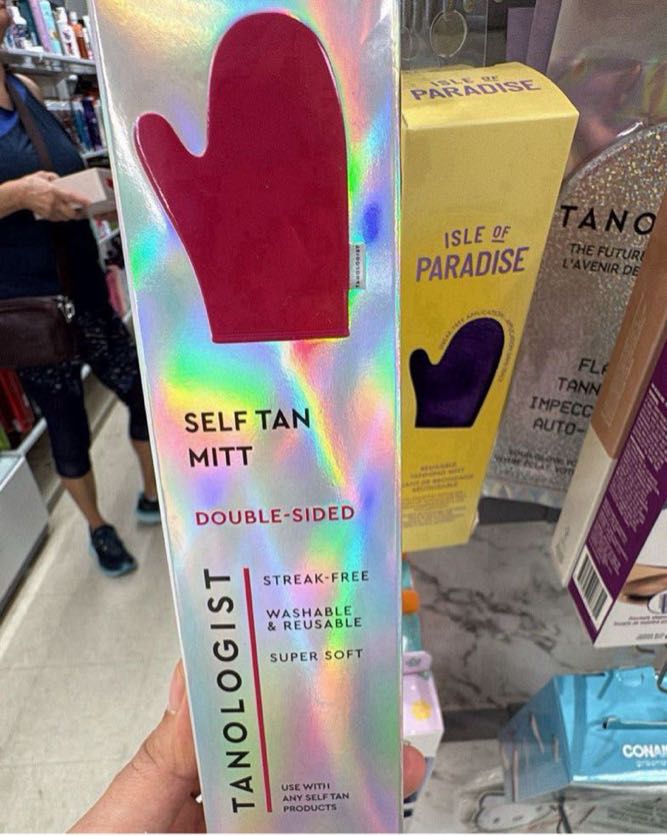 Double-sided self-tan application mitt, streak-free, washable, and reusable.