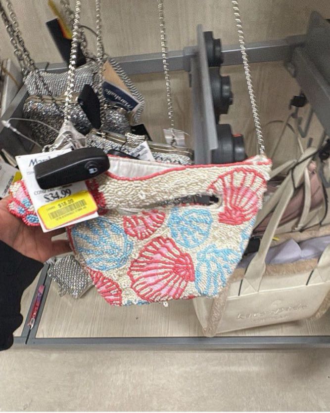 A stylish handbag featuring a colorful shell pattern in pink and blue, perfect for casual outings.