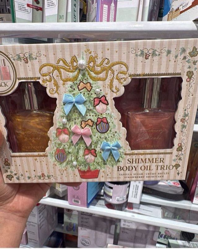 A festive gift set featuring three shimmer body oils in vanilla and sugar scents, beautifully packaged for the holiday season.