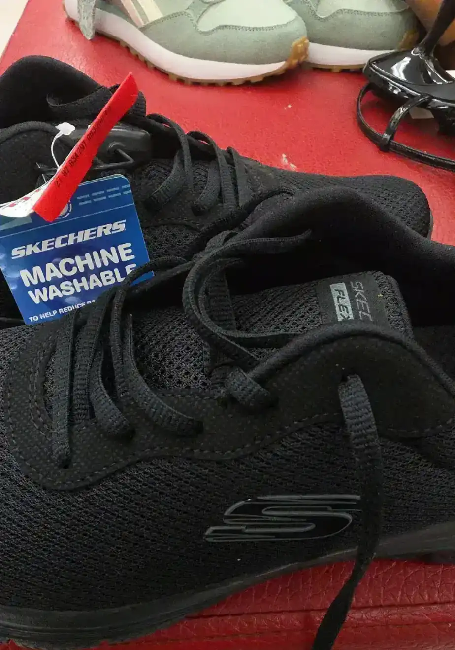 Black Skechers Flex shoes featuring a breathable mesh design and machine washable label.