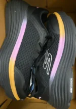 Comfortable black sneakers with a purple and orange sole, designed for maximum cushioning.