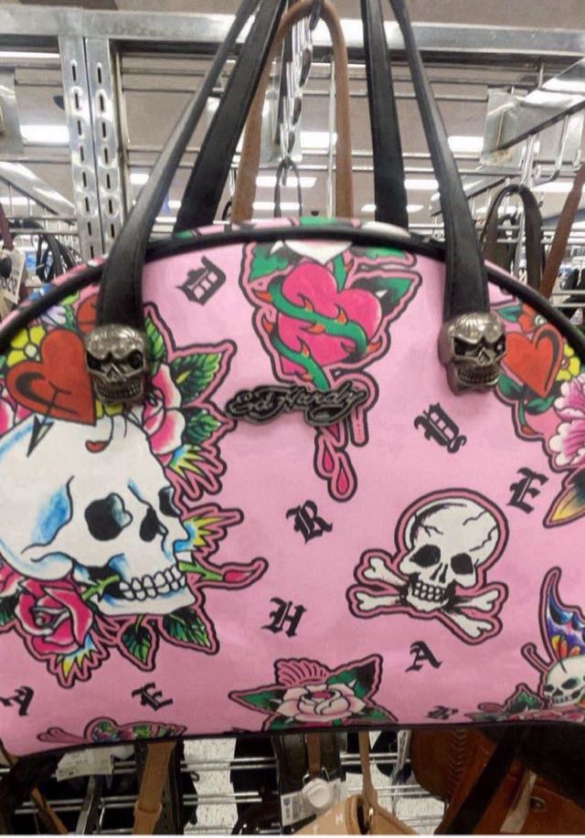 A stylish handbag featuring a vibrant pink background with skull and floral designs, accented with black handles and skull-shaped embellishments.