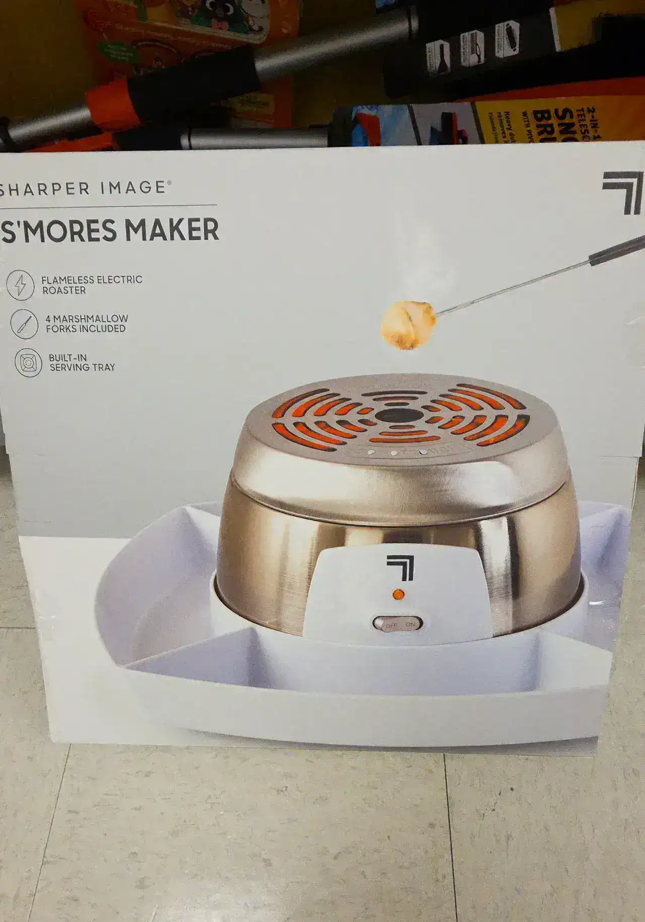 Flameless electric roaster for making s’mores, includes a marshmallow fork and serving tray.