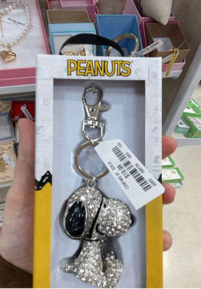 A sparkling keychain featuring Snoopy, designed with rhinestones for a stylish look.