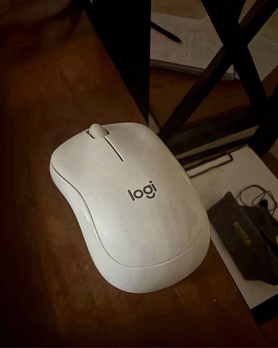 A sleek white wireless mouse with a minimalist design.