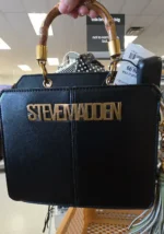 A stylish black handbag featuring a gold-tone logo and bamboo handle.
