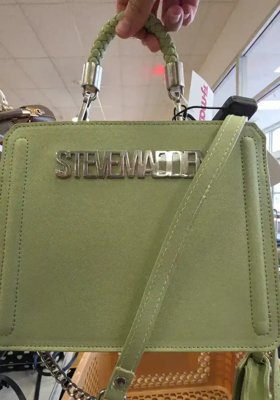 A stylish green handbag featuring a metallic logo and a braided handle.