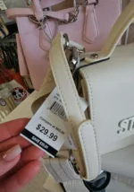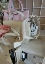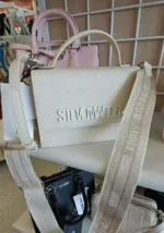 A stylish cream-colored handbag featuring a structured design and a detachable shoulder strap. Ideal for everyday use or special occasions.