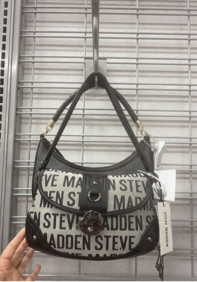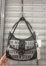A stylish handbag featuring a unique design with the brand name prominently displayed. It has a structured shape and a comfortable shoulder strap.