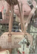A stylish pink handbag featuring the Steve Madden logo. It has a compact design suitable for everyday use.