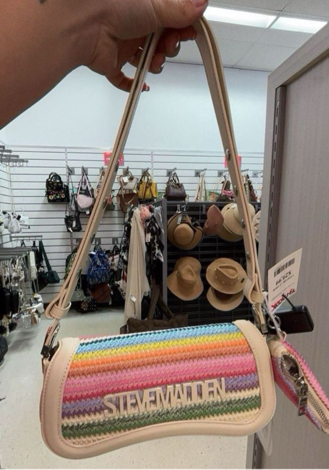 A stylish handbag featuring a vibrant striped design with the brand name prominently displayed.