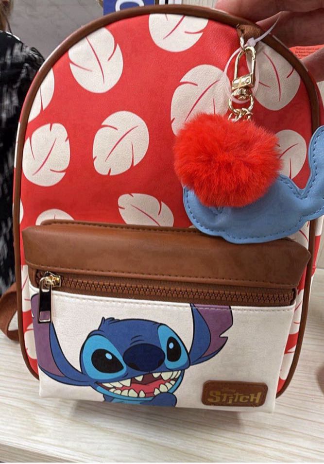 A vibrant red backpack featuring a playful Stitch design and a fluffy pom-pom keychain. Perfect for fans of Disney’s Lilo & Stitch.
