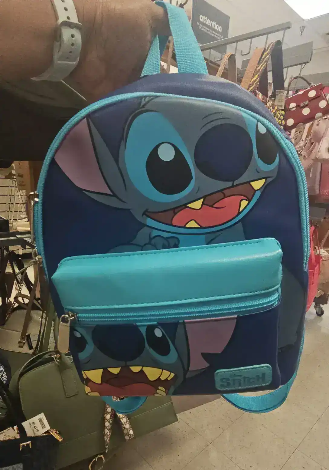 A colorful backpack featuring Stitch from Disney’s Lilo & Stitch, designed for kids with a front zip pocket.