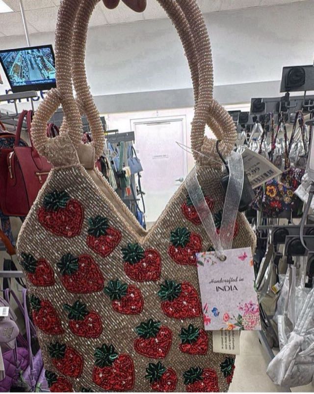 A stylish handbag featuring a unique strawberry design with sequins, handcrafted in India.