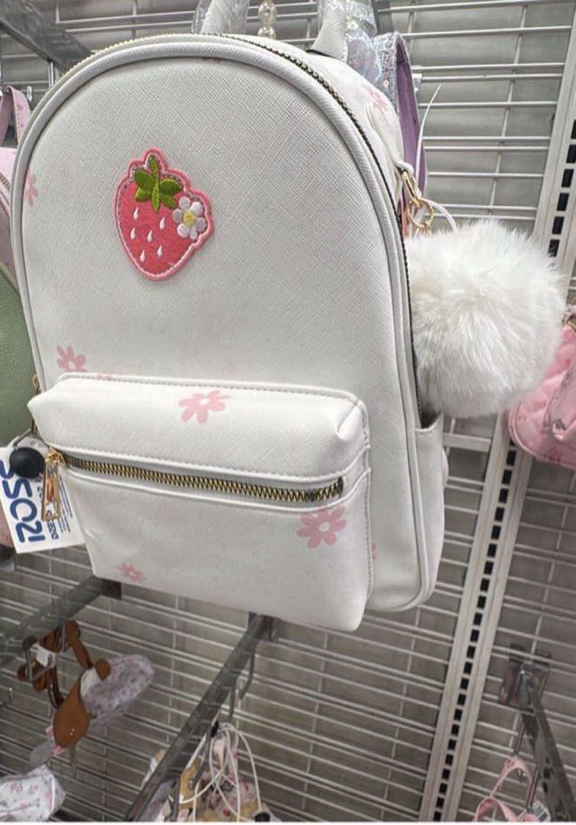 A cute white backpack featuring a strawberry design and floral accents, perfect for kids or casual outings.