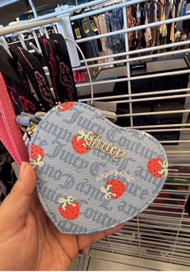 A cute heart-shaped bag featuring a strawberry print design, perfect for adding a playful touch to any outfit.
