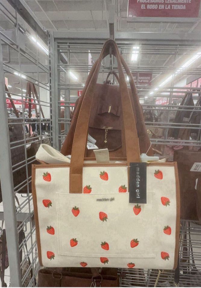 A stylish tote bag featuring a playful strawberry print, perfect for casual outings or daily use.