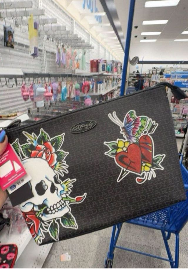 A stylish handbag featuring vibrant tattoo-inspired designs, including a skull, roses, and a butterfly.
