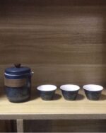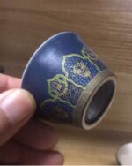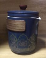 A decorative ceramic tea pot with a wooden handle and intricate designs.