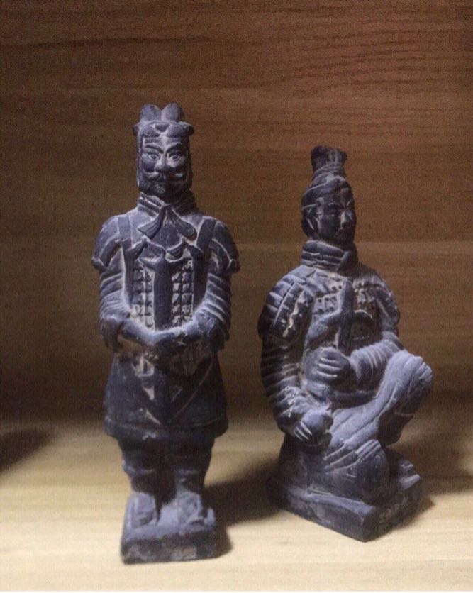 A pair of intricately designed terracotta warrior statues, showcasing detailed armor and expressions, reminiscent of ancient Chinese history.