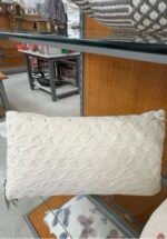 A soft, cream-colored decorative pillow with a textured pattern, perfect for adding a cozy touch to any space.