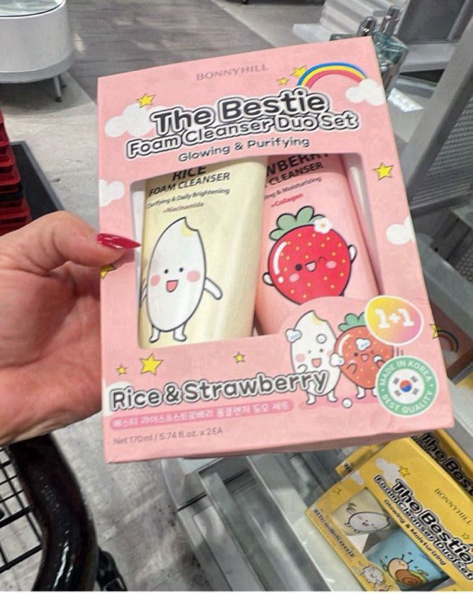 A set of two foam cleansers featuring rice and strawberry extracts for glowing and purifying skin.