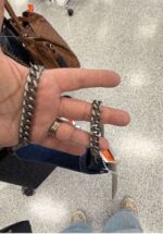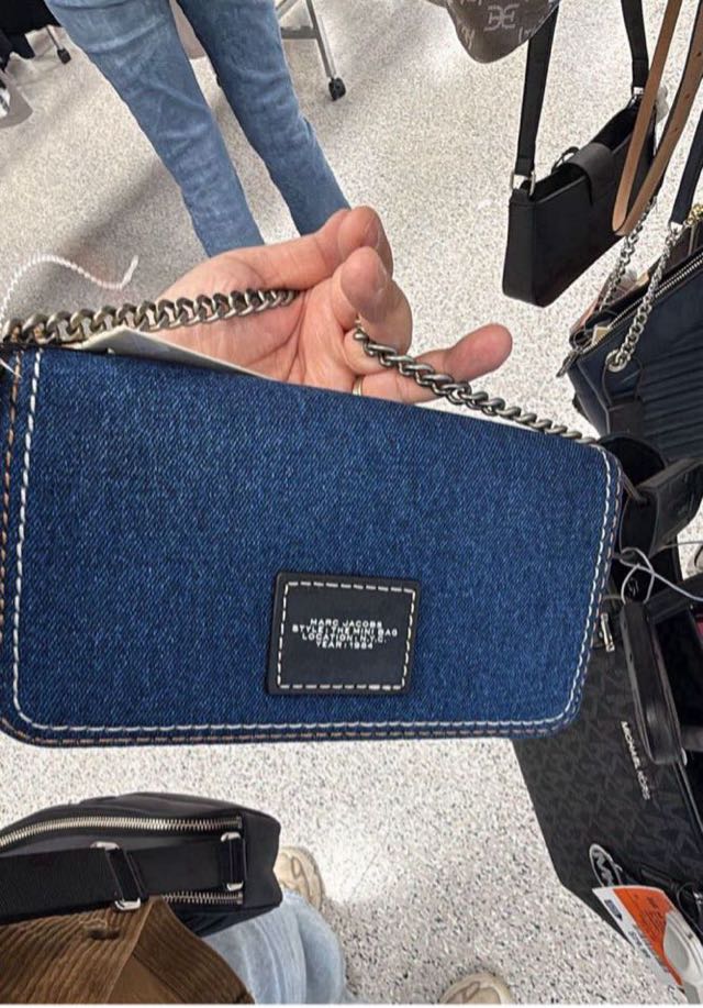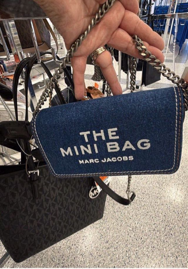 A stylish mini bag made of denim with a chain strap, featuring the brand name prominently displayed. Perfect for carrying essentials in a chic manner.