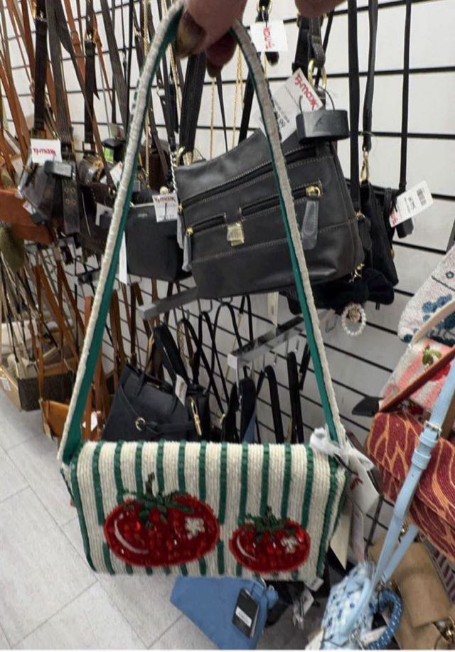 A unique handbag featuring a tomato design with a striped background, perfect for adding a playful touch to any outfit.