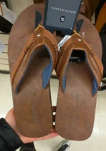 Stylish brown flip flops with denim accents, perfect for casual wear.