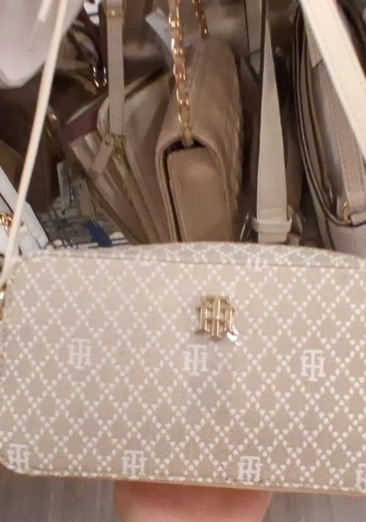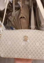 A stylish Tommy Hilfiger handbag featuring a signature logo pattern. It has a structured design suitable for everyday use.