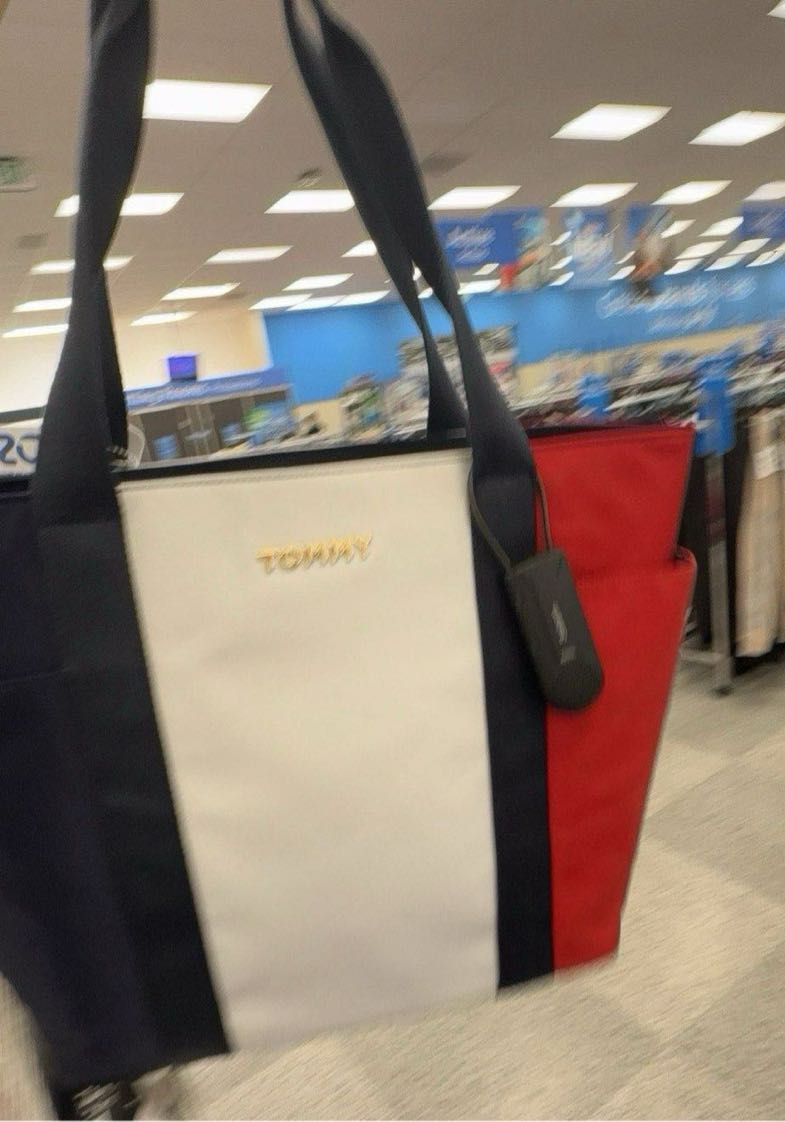A stylish tote bag featuring a classic color block design with navy, white, and red sections, adorned with the brand name ‘TOMMY’ in gold.