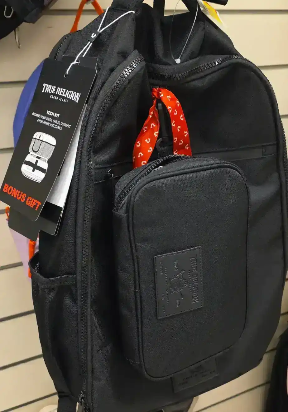 A stylish black backpack featuring a front pocket and a bonus gift tag.