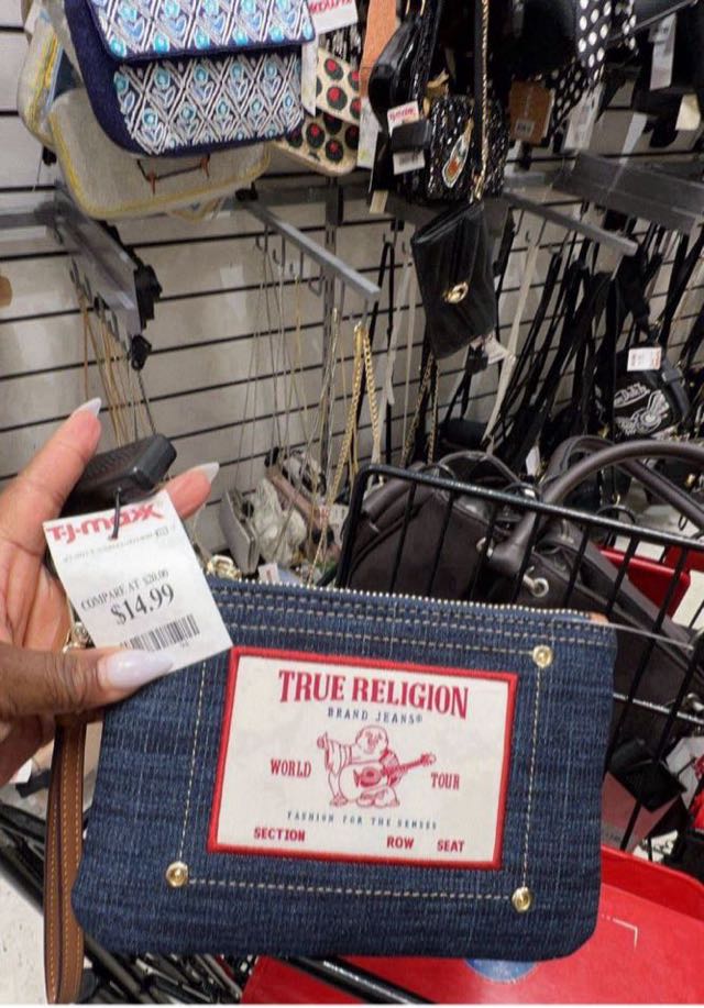 A stylish denim clutch featuring a bold True Religion logo and a convenient wrist strap.