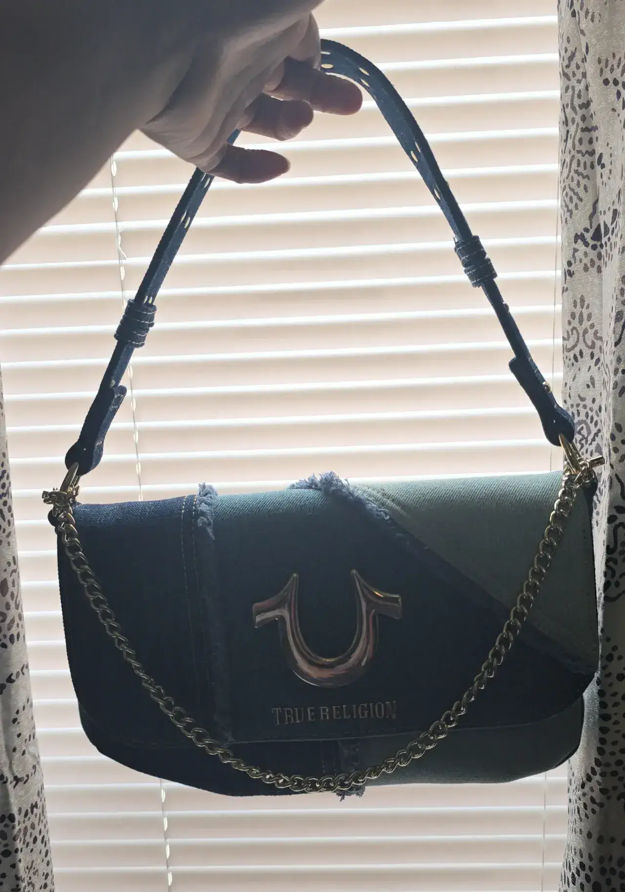 A stylish True Religion handbag featuring a unique design with a chain strap. Perfect for casual outings or special occasions.